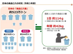 日本では、年間約523万トンもの食品ロス(事業者から約279万トン、家庭から約244万トン)が発生しており、国民一人当たりに換算すると、毎日お茶碗1杯分、年間約42キログラムの食べ物を捨てていることになります。