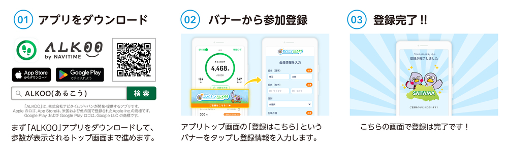 お持ちのスマートフォンに「ALKOO」アプリをダウンロードして取組に参加することで、計測した歩数は自動的に送信され、歩数に応じて「マイレージポイント」を獲得することができます。貯めたポイント数に応じて年4回の抽選に参加でき、素敵な賞品が当たります。