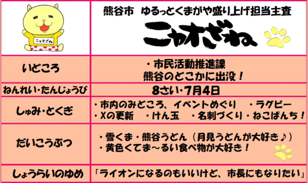 平成25年7月1日からは、「熊谷市マスコットキャラクター」として、市民活動にとどまらず、熊谷市内の商業、観光、地域行事などの盛り上げに活躍しています。