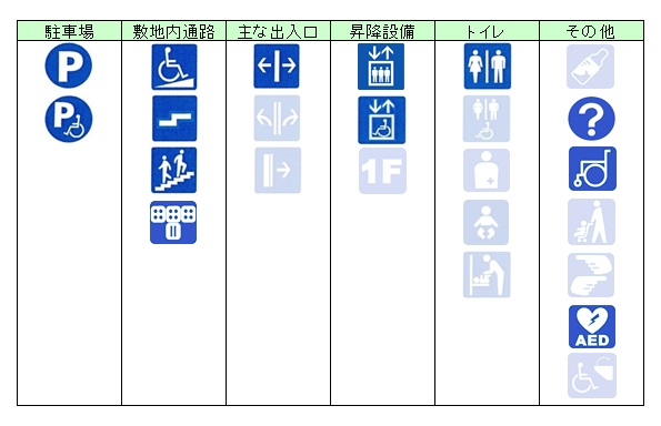なお、表の中で、ピクトグラムの色が濃く表示されている場合は「設置あり」で、薄く表示されている場合は「設置なし」を意味しています。