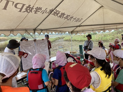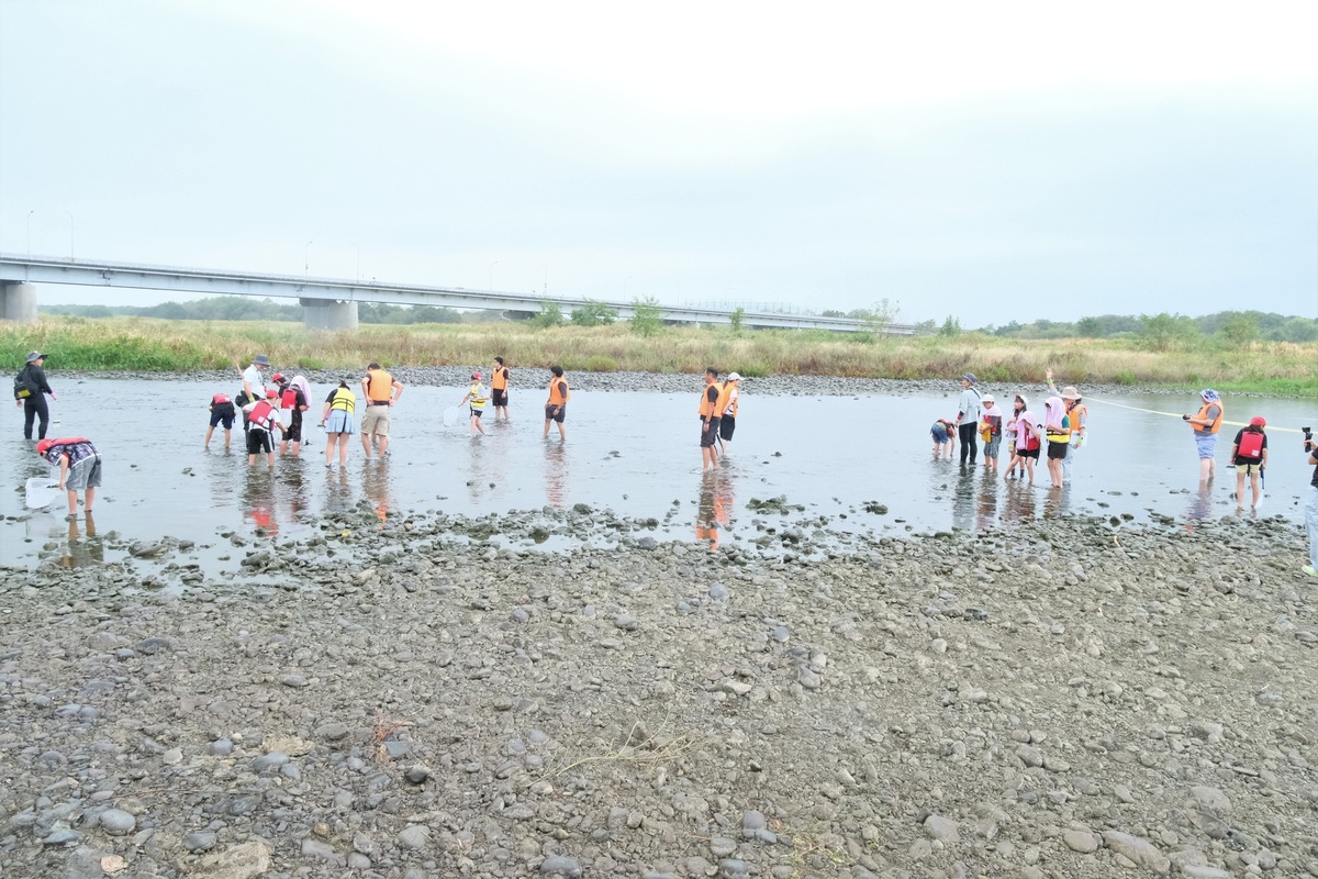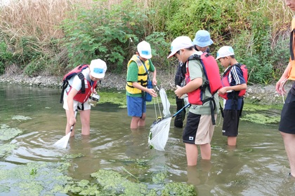 荒川河川敷での生き物採集を行い、生き物を用いた水質の簡易判定やパックテストを使った水質調査を通して、環境保全の重要性を認識してもらう「荒川水辺の自然体験学習会」を令和7年9月4日に桜木小学校5年生の授業として行いました。