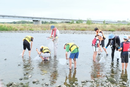 荒川の本流の浅瀬とワンド(本流と繋がっているが、水が滞留し池のようになっている場所)に入って水生昆虫などの河川生物を採取し、バケツやプラケースに確保します。