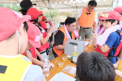 川に入る前に活動内容の説明や安全教室を行い、市長からも挨拶をいただきました。