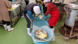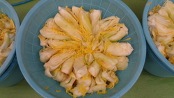 キムチを作るためには、ハクサイの下漬けから始まります。講師のかたと一緒に、ハクサイの収穫、塩漬け、ざる上げ、キムチのたれに混ぜる