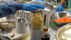ニンニク、ショウガ、タマネギ、りんごを小さめに切ったものにイワシのエキスを入れてミキサーにかけます。ダイコン、ニンジンは千切りにし、塩を振っておきます。ニラやハクサイは適当な長さに切っていきます。