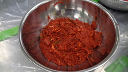 ミキサーをかけたものにあみの塩辛、砂糖、味の素、唐辛子、水あめをボールなどに入れてよく混ぜます。さらに上新粉で作った糊も加えていきます。ダイコン、ニンジン、ニラ、ハクサイを混ぜて完成です。
