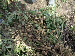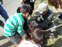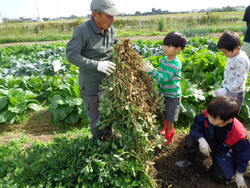 ラッカセイは、ネットを外し、株のまわりをシャベルで掘り、ていねいに引き抜きました。まだ成長途中でしたが、みんな目を輝かせながら収穫作業に取り組み、先生からラッカセイの