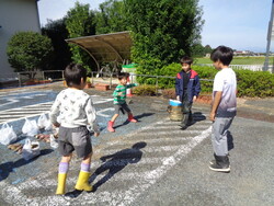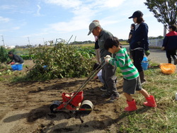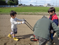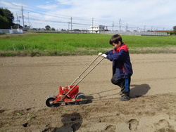 最後に、種まき機(ごんべえ)を使って、ホウレンソウ、カブ、コマツナの種まきをしました。ごんべえが、土に溝を作り、その溝に種をまき、土をかぶせ、鎮圧までやってくれました。子ども達が交代しながら楽しく種まきを行いました。