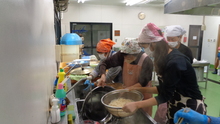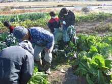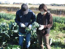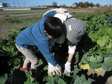 農作業では、作物の収穫を行いました。共有畑のナスとオクラは残念ながら収穫がなく、ホウレンソウ、コマツナ、カブは成長が遅く、収穫数が少ない状態でした。また、葉が15センチメートルくらいのニンジンは成長中なので収穫しませんでしたが、サトイモ、ラッカセイ、ピーマンは全て収穫し、ネギは1家族7本程度収穫しました。家族で管理している家族用畑にはキャベツ、ダイコン、ブロッコリー、ハクサイが立派に育っていたので、必要な分の収穫を行いました。