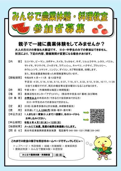 ミニトマト、カボチャ、スイカ、サツマイモ、ブロッコリーなどの野菜の栽培・収穫、食育スクール、熊谷産農産物を使った料理教室などを行います。