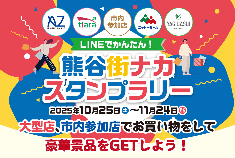 市内店舗の利用による経済効果の創出を目指して、市内大型商業施設4館(アズ熊谷・ティアラ21・ニットーモール・八木橋)と市内参加店、合計250店舗以上の合同企画『LINEでかんたん!熊谷街ナカデジタルスタンプラリー』を開催します。