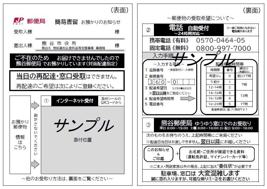 - 上記の受付期間、受付時間外の受取はできません。