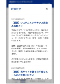 「×」ボタンまたは、ウィンドウの外をタップすると「お知らせ」ウィンドウが閉じます。