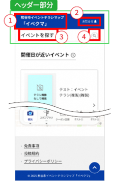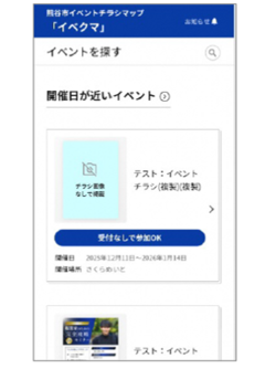 熊谷市イベントチラシマップ「イベクマ」(以下「イベクマ」)の閲覧機能では、熊谷市で開催されるイベント情報を、閲覧、検索できます。