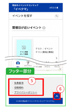 タップすると、それぞれ「免責事項」「投稿規約」「プライバシーポリシー」の各ページへ移動します。