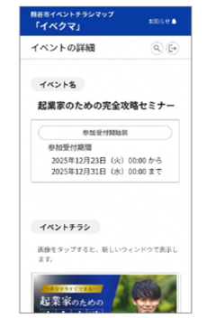 また、イベントの詳細な情報を、位置情報とチラシ画像と一緒に確認することができます。
