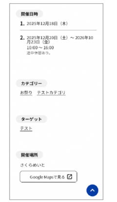 登録された開催場所や、住所が表⽰されます。また、開催場所を「Google Maps」で確認するための「Google Mapsで⾒る」ボタンが表⽰されます。