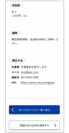 イベント情報の掲載内容に不適切な内容があった場合に、管理者へ報告できます。
