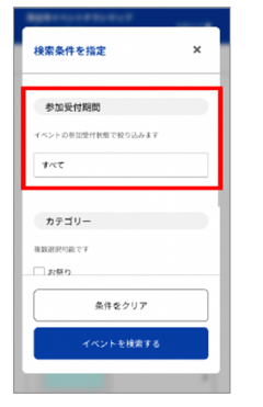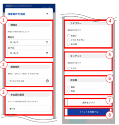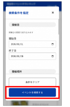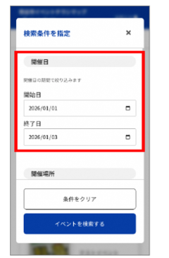 開催⽇や、開催期間でイベントを検索する場合に使⽤します。指定した「開始⽇」と「終了⽇」の期間内に開催⽇時が登録されているイベントを絞り込みます。