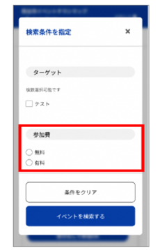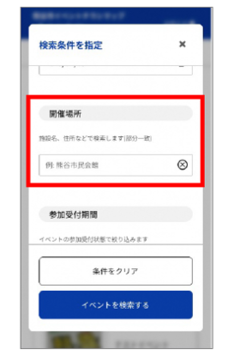 開催場所(施設名や住所)でイベントを検索する場合に使⽤します。⼊⼒した内容と、イベントに登録されている「開催場所」の内容が、⼀部でも⼀致するイベントを絞り込みます。