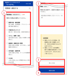 「管理者へ報告する」画面(不適切な投稿の報告機能)