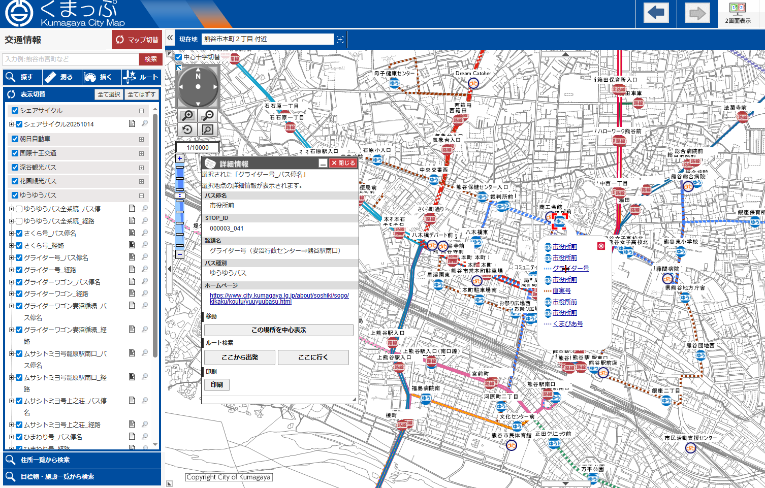 市の行政情報や地図情報をインターネット上でご確認いただける電子マップ「くまっぷ」に、路線バスやシェアサイクル、ゆうゆうバスなどのバス経路、バス停、ポート情報が確認できる交通情報ページが作成されました。