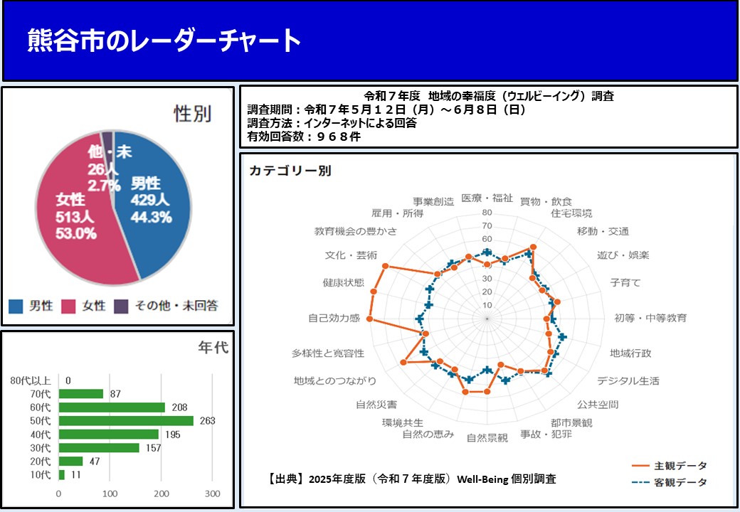 「主観詳細」を選択し、「自治体」において「埼玉県熊谷市」を選択することで調査結果を確認できます。