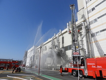 地域住民へ火災に対する警戒心を注意喚起するため、株式会社ニコン熊谷製作所において、消防職員46人と消防団員102人で消防総合演習を実施しました。