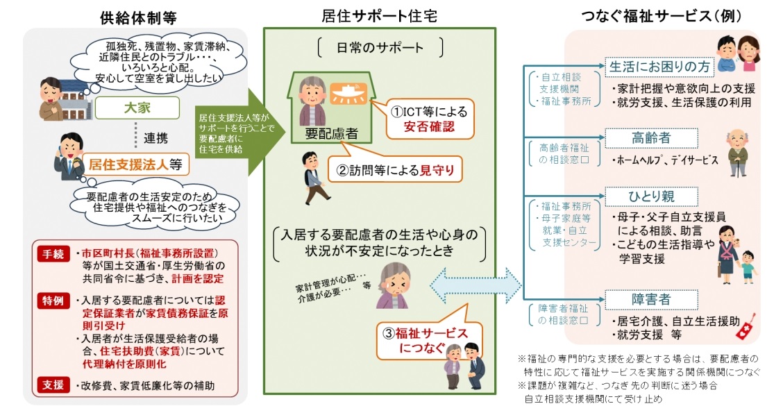 現在、高齢者や単身世帯の増加、持ち家率の低下が進んでいることから、今後、高齢者や低所得者、障害者などの要配慮者の賃貸住宅への居住ニーズがさらに高まると見込まれています。また、賃貸人の中には要配慮者の孤独死や死亡後の残置物処理等の入居後の課題に対して不安を持っている賃貸人のかたが多くいます。これらを背景として、要配慮者が安心して生活を送るための住まいを確保できるよう、令和6年6月に「住宅確保要配慮者に対する賃貸住宅の供給の促進に関する法律」(住宅セーフティーネット法)が改正され、居住サポート住宅(居住安定援助賃貸住宅)が創設されました。