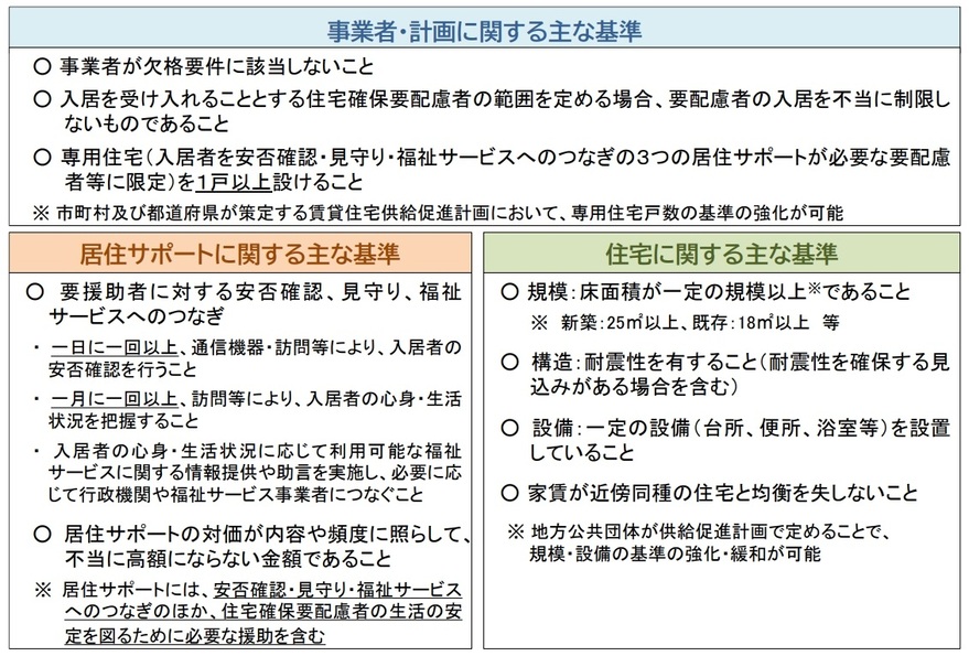 居住サポート住宅の認定基準として、事業者・計画に関する主な基準、居住サポートに関する主な基準(ソフト)、住宅に関する主な基準(ハード)が設けられています。