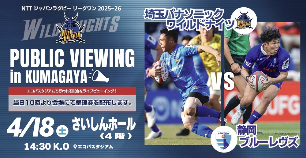 ビジターゲーム(埼玉ワイルドナイツ vs 静岡ブルーレヴズ)のパブリックビューイングをさいしんホールで実施します。