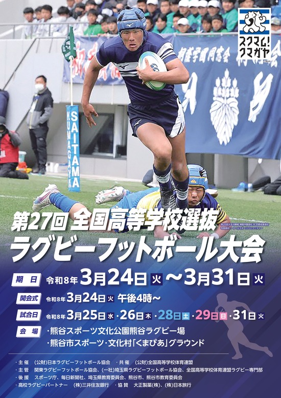 桜の花とともに熊谷に春の到来を告げる「全国高等学校選抜ラグビーフットボール大会」が、令和8年3月24日(火曜日)から31日(火曜日)の期間で開催されます。