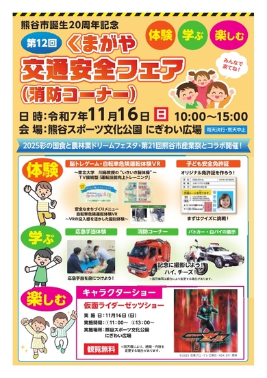 令和7年11月16日(日曜日)10時から15時まで、熊谷スポーツ文化公園にぎわい広場で、第12回くまがや交通安全フェア(消防コーナー)を開催します。