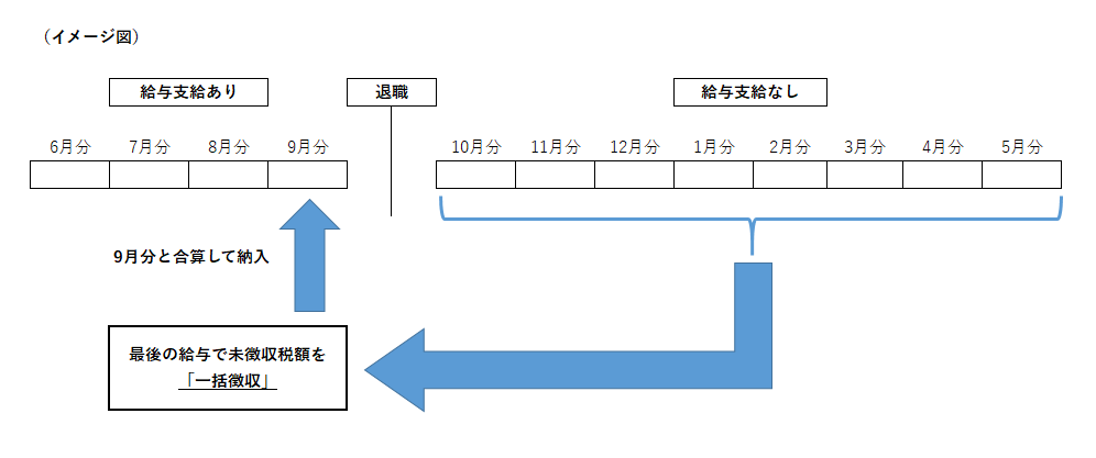なお、未徴収税額が最後の給与支給額を上回ることで一括徴収できない場合、普通徴収に切替えができます。ただし、出国または帰国までに納税義務者が未徴収税額を納付することができない場合、納税管理人を選任していただくよう案内してください。