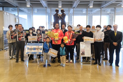 市長表敬後の記念撮影(親松選手と丸山選手)