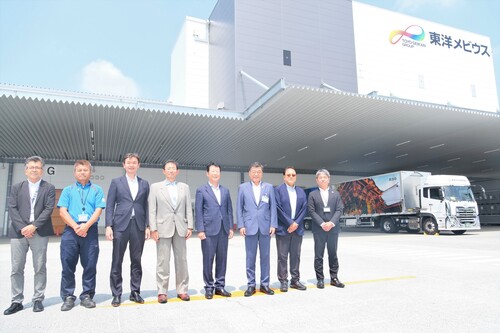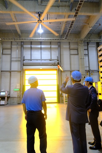 東洋メビウス株式会社では、高密度自動倉庫を採用し、スペースの削減と保管量の増加、入庫から出庫までの自動化を実現しています。高密度自動倉庫棟では、トラックの搬入口まで自動的に荷物が運ばれてくるため、荷物の取り出しからトラックへ積み込むまで、フォークリフトを介した作業がなくなり、待ち時間も少なくドライバー1人でもスムーズに搬出することができます。また、フォークリフトが通行するスペースを削減できるため、保管容量の増加にもつながっています。実際の作業を目にした市長は、ドライバー1人だけで搬出が完結していることに大変感心していました。
