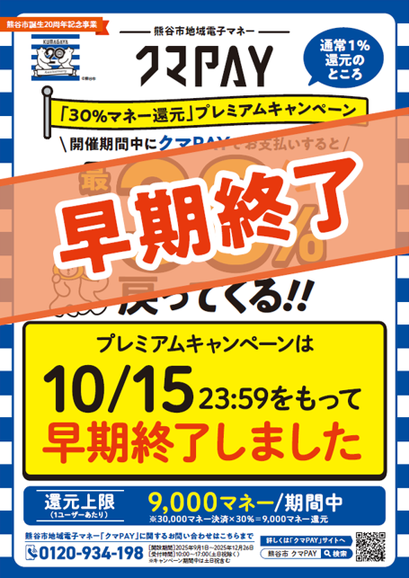 早期終了となる場合、熊谷市公式LINEや市ホームページ、取扱加盟店店頭などにおいて、あらかじめご案内を行う予定です。