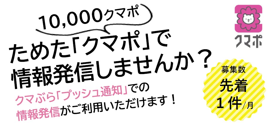 クマぶらユーザー(約6万人)に情報発信できますので、ぜひご活用ください。