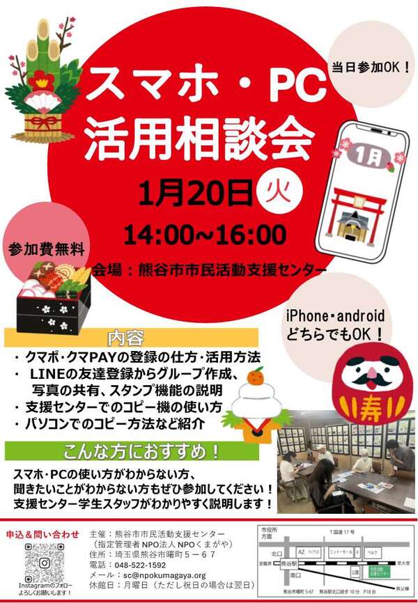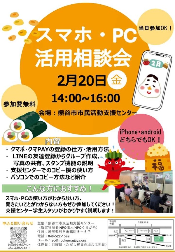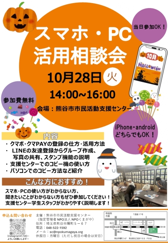 クマPAYやクマポなどの登録方法の紹介、LINE活用方法やスマホの操作に関する相談をお受けします。また、市民活動支援センターのコピー利用やパソコンの利用方法などの紹介をします。