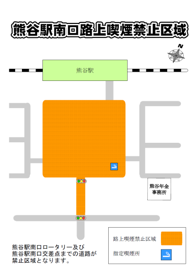- 特に、迷惑喫煙による被害が発生する可能性が高い場所を、喫煙禁止区域に指定し、路上等における喫煙を禁止します。これにより、平成18年10月1日から、熊谷駅を中心とする市街地の一部と籠原駅の駅前が喫煙禁止区域となりました。