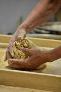 五家宝は、今もなお昔から継承されてきた独特の手作り技法によって、熟練した職人の腕や勘に頼りながら、家内工業的に作られています。