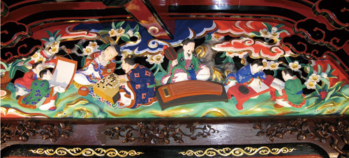 聖天堂の琴棋書画の彫刻に目を向けると、左から「絵を見る子ども」、「碁を打つ人々」、「琴を弾く男」、「文字を読み書きする子ども」の順で配されており、彫られた人々の温和な表情が、見る人の心を和ませてくれます。