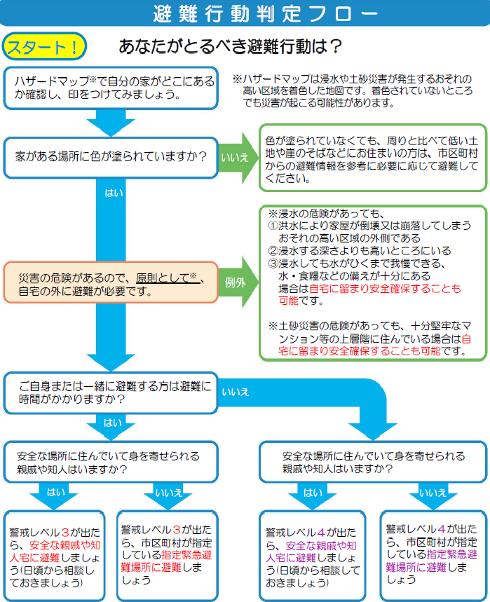 自分の住んでいる場所が、浸水想定区域や土砂災害警戒区域に該当するか確認しましょう。該当しない場合は、無理に避難所へ避難するのではなく、自宅内の安全な場所での避難(在宅避難)の検討をお願いします。