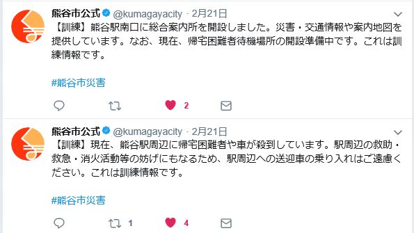 訓練にあわせて市公式ツイッターで呼びかけを行う(ハッシュタグを使用)
