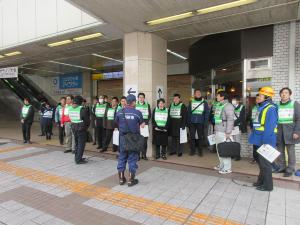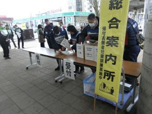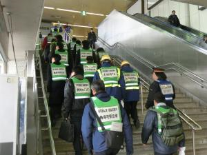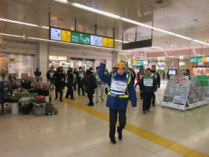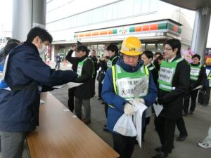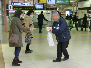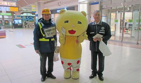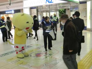 また、熊谷市長、市マスコットキャラクター「ニャオざね」とともに駅構内で啓発チラシの配布を行い、利用客に「災害時の一斉帰宅の抑制」を呼びかけました。