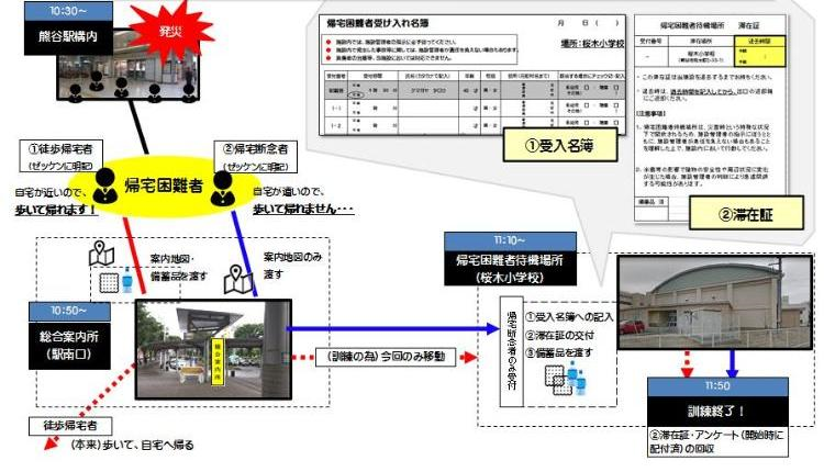 注意:本来、帰宅困難者待機場所となる施設は「文化会館」ですが、耐震工事中であったため、本訓練では「桜木小学校」を待機場所として設定しました。