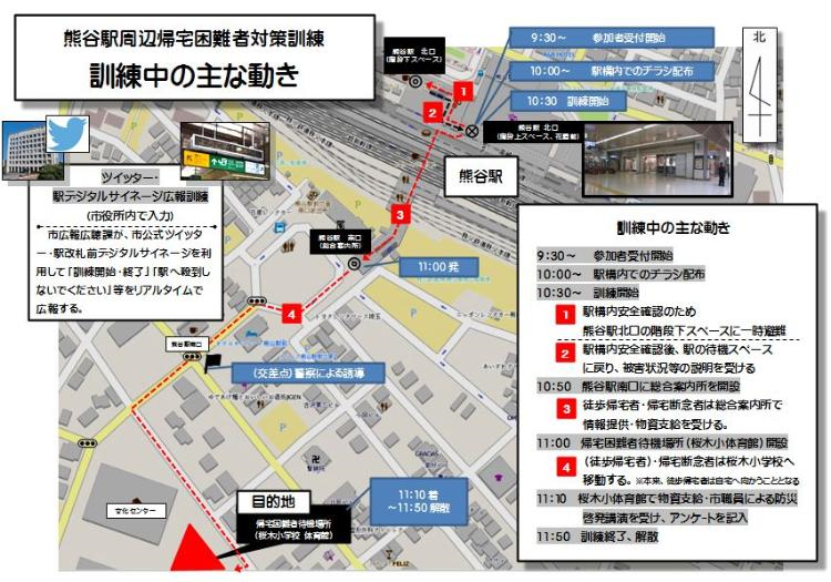 駅事業者、宿泊施設、大規模商業施設、県及び市等で構成する「熊谷市主要駅周辺帰宅困難者対策協議会」が行う初めての訓練でしたが、47人の参加者が実地で帰宅困難者対策の基本的な流れを体験することにより、災害時の誘導や各構成員の役割について検証することができました。