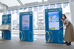 左のサイネージでは市内の地図や観光案内など、タッチパネルを使って調べることができます。