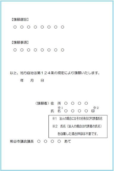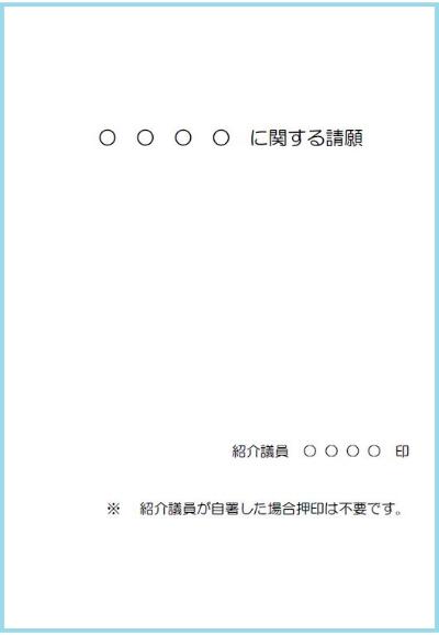 陳情書には、紹介議員は必要ありません。記載事項は請願書と同じです。書式例を以下にお示しします。